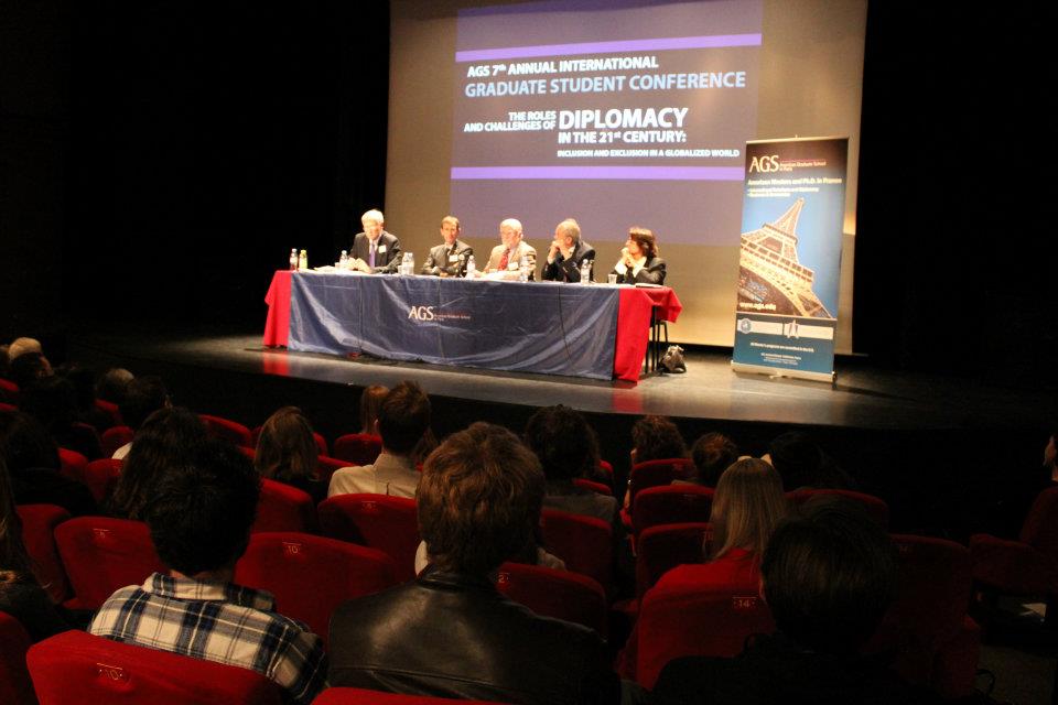 On April 19-20, the American Graduate School in Paris hosted its 7th Annual Graduate Student Conference on "The Roles and Challenges of Diplomacy in the 21st Century: Inclusion and Exclusion in a Globalized World". Participants from Norway, Canada, South Africa, India, the United States, Russia, Spain, Australia, Lebanon, Israel, Iran, Germany, Switzerland, Portugal, Sri Lanka, Barbados, Venezuela, Belgium, and France exchanged their experiences, research findings and ideas on the subject. Around 100 academics, journalists and professional diplomats joined in the audience to take part in the debates.