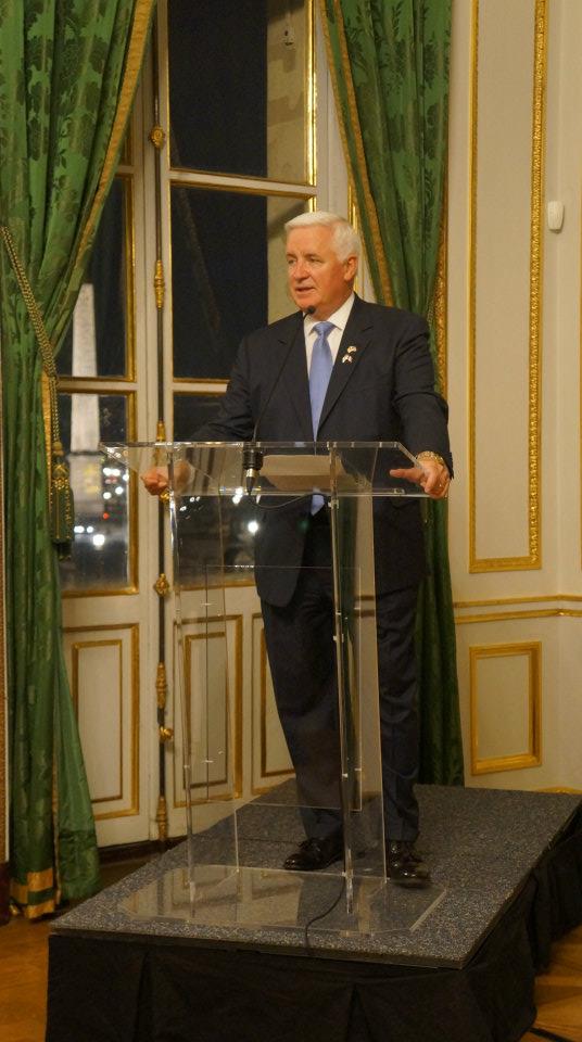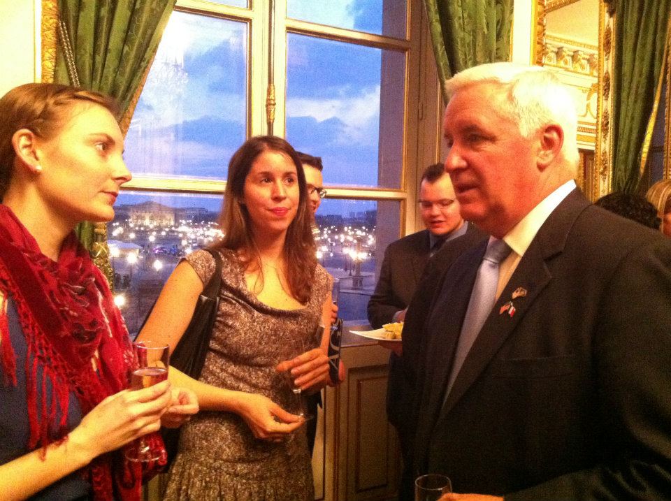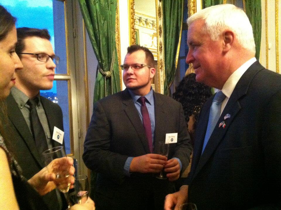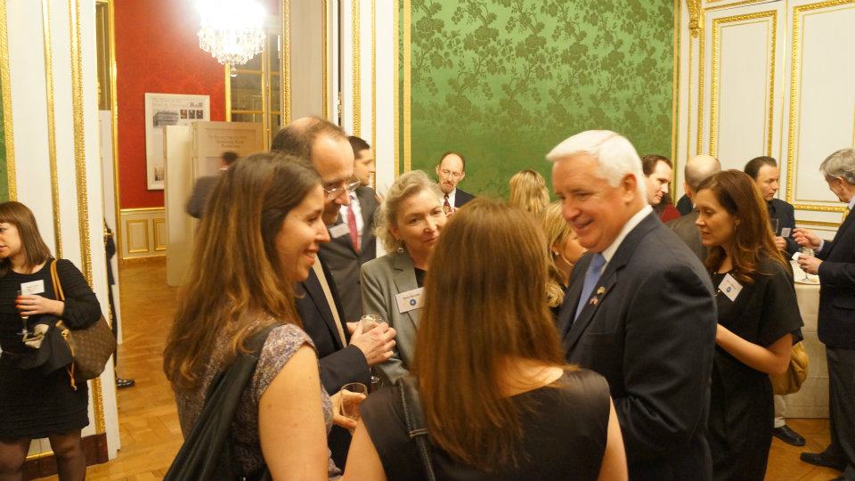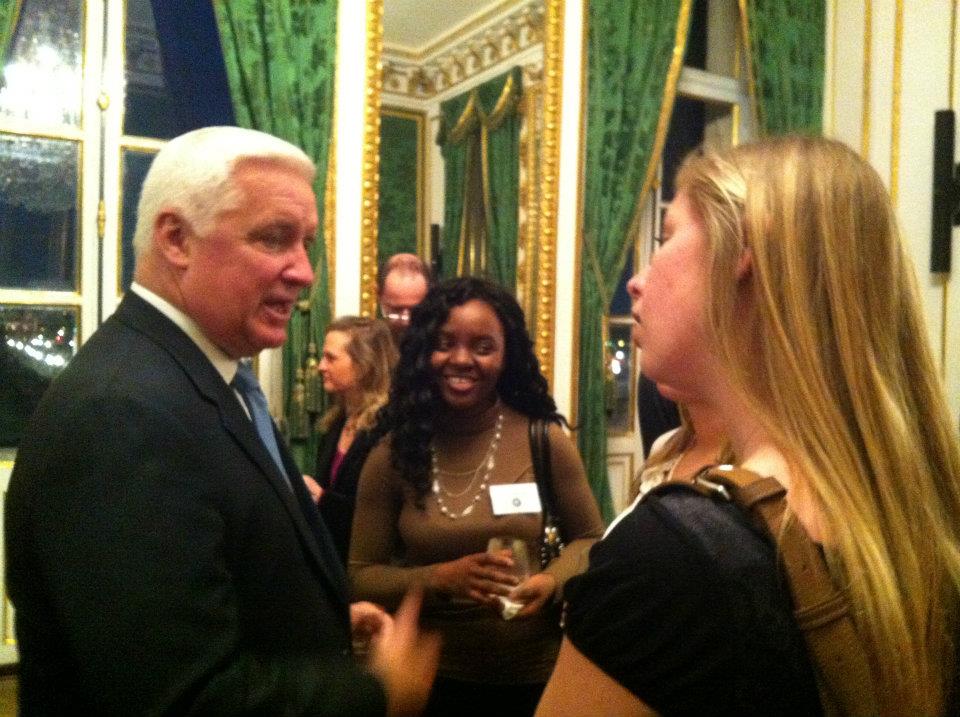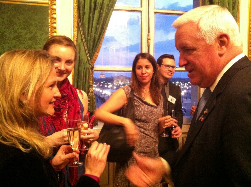 Ten AGS alumni and students met with Pennsylvania Governor Tom Corbett during a reception hosted for the Governor's first investment and trade mission to France. The reception was open to alumni and students of all Pennsylvania colleges and universities residing in France. The Master's in International Relations and Diplomacy at AGS being an affiliated program of Arcadia University in Pennsylvania, Arcadia President Carl (Tobey) Oxholm III invited AGS to represent Arcadia University at the reception, as alumni of this program are also alumni of Arcadia University.